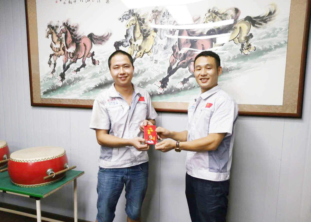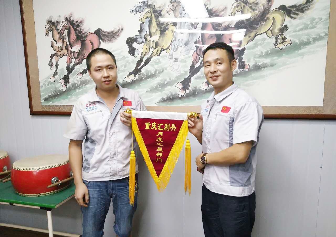 會(huì)上,首先大家對新同事的加入表示熱烈的歡迎,其次由張副總為新同事贈(zèng)送匯利興紀(jì)念小禮物;觀看(你想過放棄嗎?)小視頻,面對一切永不放棄、永拼到底的加油精神!然后各部門做簡短自我介紹,不斷認(rèn)識(shí)自己、了解自己了解他人創(chuàng)造一切的不可能,最后會(huì)議以每月度之星及月度部門的選舉而落下帷幕。 對企業(yè)三道“人道、孝道、商道”行三鞠躬 敲擊士鼓,士氣比武器更重要 俗話說:一份耕耘一份收獲,不付出就不會(huì)有收獲,兩者始終成正比。雖然在這條耕耘的道路上也許會(huì)布滿荊棘并揮汗如雨,也許會(huì)經(jīng)風(fēng)雨洗禮且精疲力盡但這一切都是人生的寶貴財(cái)富及成功的支點(diǎn),雖然過程是苦澀的但結(jié)果總是是甜蜜的。然此次最佳部門獎(jiǎng)為“物控部”,月度之星“徐財(cái)華”戰(zhàn)士,在此感謝他們的付出與努力,相信匯利興在大家的一起陪伴及努力下夢想定會(huì)離我們的越來越近,加油! 胡總經(jīng)理(圖右)與月度部門“物控部”主管徐財(cái)華(圖左)合影 胡總經(jīng)理(圖右)與月度部門“月度之星”徐財(cái)華(圖左)合影