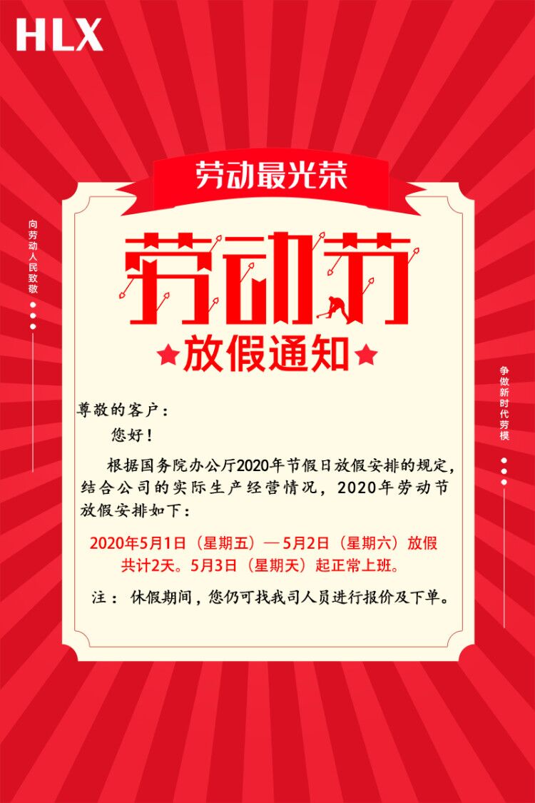 尊敬的客戶: 您好! 根據(jù)國務(wù)院辦公廳2020年節(jié)假日放假安排的規(guī)定,結(jié)合公司的實(shí)際生產(chǎn)經(jīng)營情況,2020年勞動(dòng)節(jié)放假安排如下: 2020年5月1日(星期五)— 5月2日(星期六)放假,共計(jì)2天。5月3日(星期天)起正常上班。 放假期間,為避免發(fā)貨延遲請(qǐng)?zhí)崆白龊糜唵伟才?。由此給您帶來的不便,敬請(qǐng)諒解!