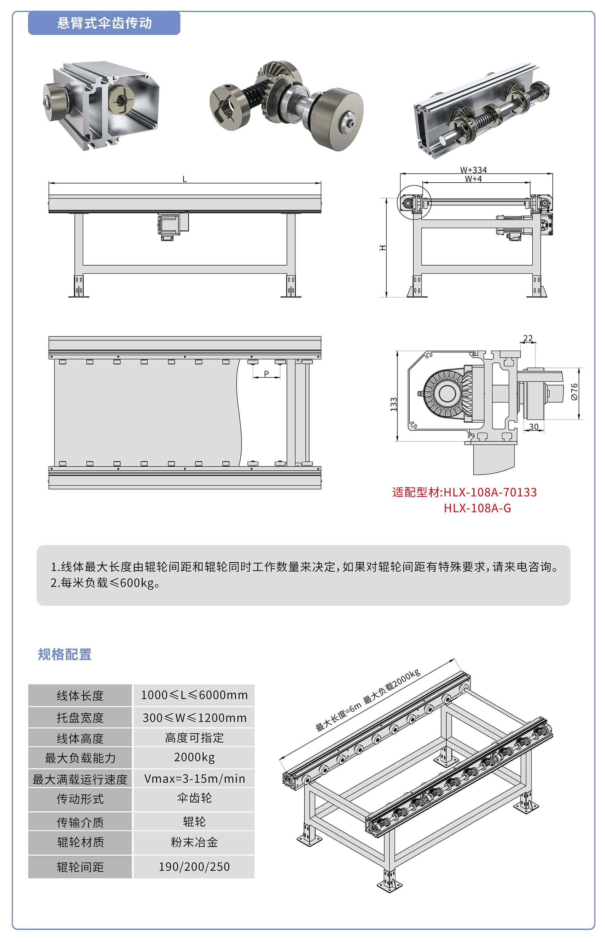 采用70133鋁型材,傘齒驅(qū)動,粉末冶金滾輪鑲嵌銅套實現(xiàn)積放功能,負(fù)載2000kg/米,最大負(fù)載速度15M/min, 輪距190、200、250可選,適用托盤寬度300-1200mm,線體長度范圍1000-6000mm, 高度根據(jù)需求定制.