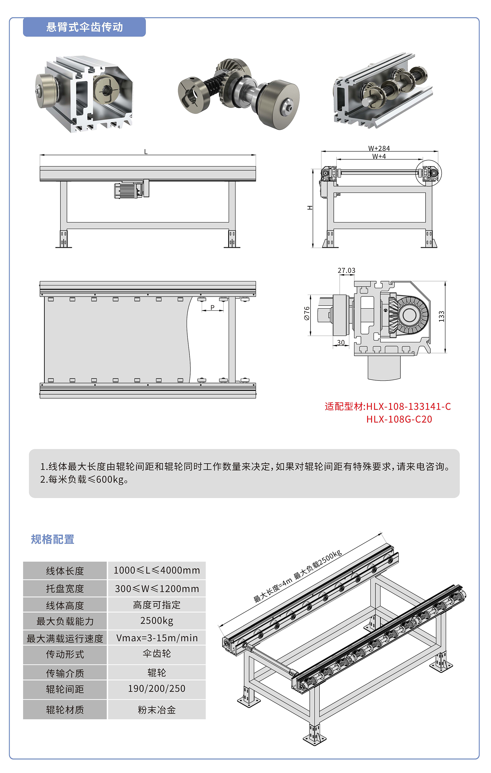 采用133141鋁型材,傘齒驅(qū)動(dòng),粉末冶金滾輪鑲嵌銅套實(shí)現(xiàn)積放功能,負(fù)載2500kg/米,最大負(fù)載速度15M/min, 輪距190、200、250可選,適用托盤寬度300-1200mm,線體長(zhǎng)度范圍1000-4000mm, 高度根據(jù)需求定制.