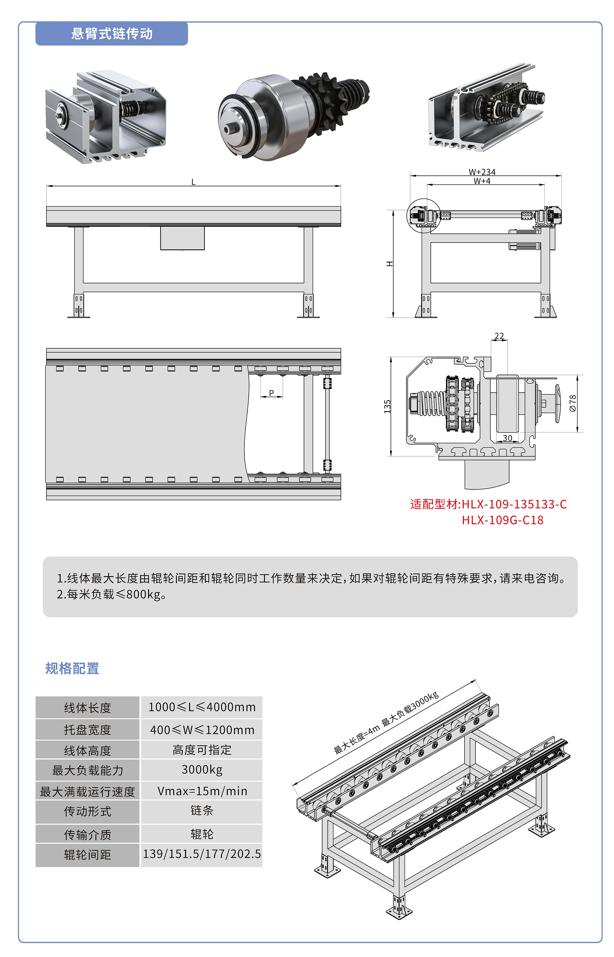 采用135133鋁型材,鏈輪傳動(dòng),鍍鉻滾輪鑲嵌銅套實(shí)現(xiàn)積放功能,負(fù)載3000kg/米,最大負(fù)載速度15M/min, 輪距139、151.5、177、202.5可選,適用托盤(pán)寬度400-1200mm,線體長(zhǎng)度范圍1000-4000mm, 高度根據(jù)需求定制.