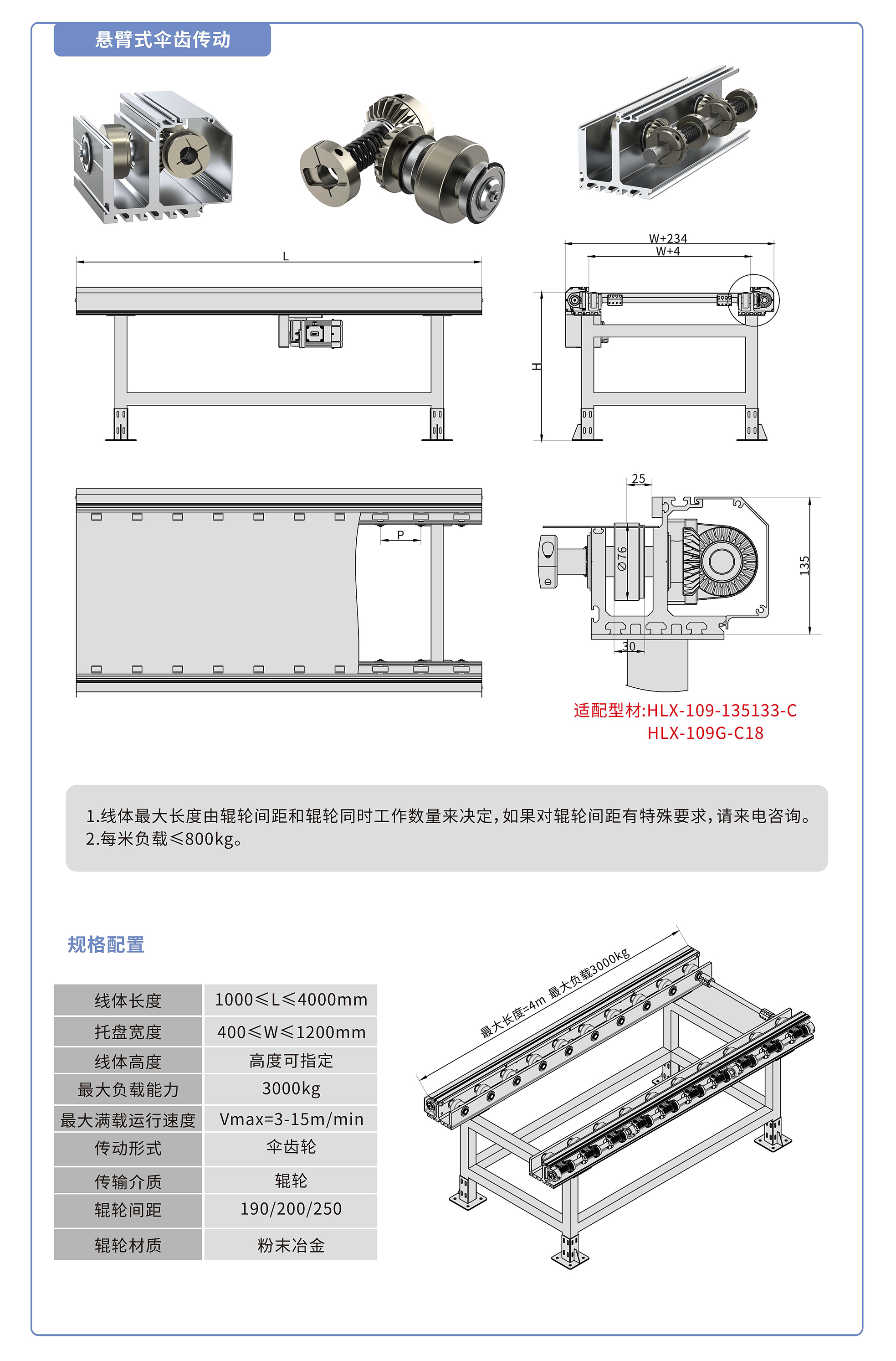 適配135133鋁型材,采用傘齒驅動,鍍鉻滾輪鑲嵌銅套實現(xiàn)積放功能,負載3000kg/米,最大負載速度15M/min, 輪距190、200、250可選,適用托盤寬度400-1200mm,線體長度范圍1000-4000mm, 高度根據(jù)需求定制.